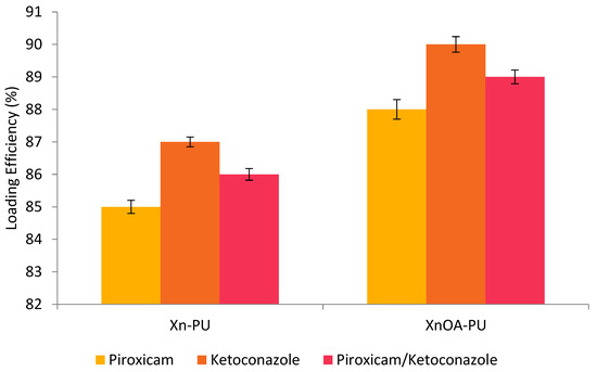 Considering the strength of hydrogen bonds and correlating the information in Table 1 and Table 2, the biomaterial with only piroxicam had the highest HBI index due to its larger polar surface (108 Å) and the significant number of atoms involved in forming hydrogen bonds (12), especially when compared to ketoconazole (logP 4.35 and number of hydrogen bond acceptors 6). Data from Table 2 suggest that both the structural organization and the LOI value were more pronounced for the biomaterials only containing ketoconazole, roughly 54% for Xn-PU-K and 62% for XnOA-PU-K, because of its semi-crystalline nature and hydrophobicity, which aligns well with oleic acid residues.