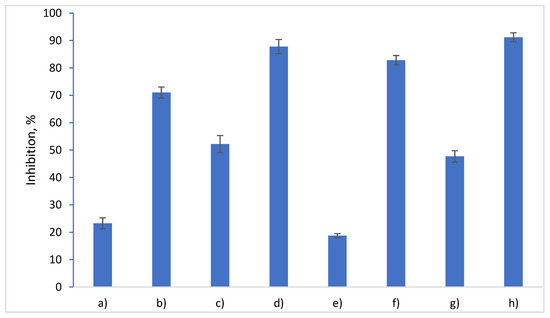 The anti-inflammatory potential of the materials is primarily attributed to the inclusion of piroxicam in their composition. The observed inhibition of protein denaturation, specifically bovine albumin, by these materials ranged between 71% and 83% (Figure 12). The denaturation process involves changes in electrostatic, hydrogen, hydrophobic, and disulfide bonding.