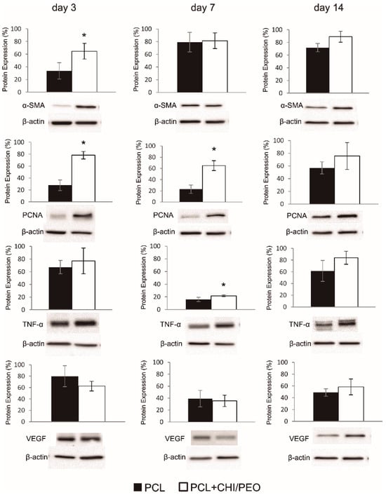Western blot analysis and densitometric analysis of smooth muscle actin (α-SMA), PCNA, Tumor Necrosis Factor (TNF-α), and VEGF observed in the excision lesions of mice topically treated with PCL or PCL+CHI/PEO membrane on days 3, 7, and 14. The results were expressed as mean ± standard deviation. (*) p < 0.05 indicates statistically significant differences between treatments according to the Student’s t-test. (n = 4–6). Protein expression levels were standardized against the internal β-actin expression levels of each sample.