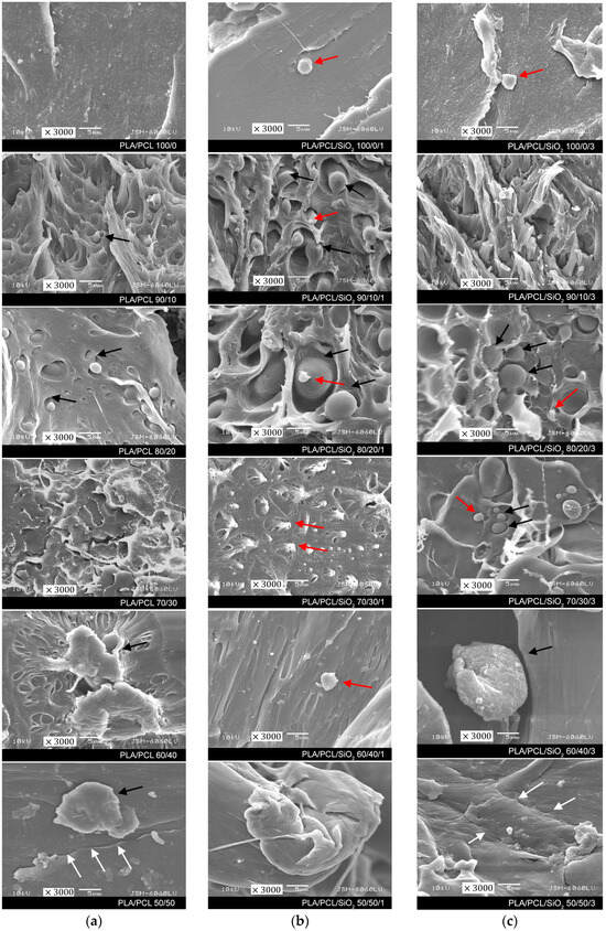 SEM micrographs of fracture surfaces of PLA/PCL/SiO2 samples: (a) without SiO2, (b) with 1% SiO2, and (c) with 3% SiO2 (mag. 3000×). Black arrows show spherical PCL domains, red arrows show agglomerates of nano-SiO2, and white arrows mark the cracks and slight delamination of the materials.