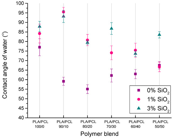 The contact angle of water on the solid is indicative of the changes in the hydrophilicity of a solid material. Measured contact angles of water on PLA/PCL/SiO2 blends are presented in Figure 2.