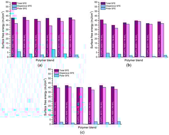 Surface free energy of PLA/PCL blends with: (a) 0% SiO2, (b) 1% SiO2, and (c) 3% SiO2.