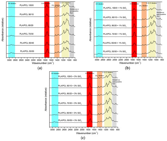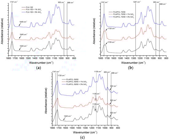 FTIR – ATR spectra of PLA/PCL blends with: (a) 0% SiO2, (b) 1% SiO2, and (c) 3% SiO2.