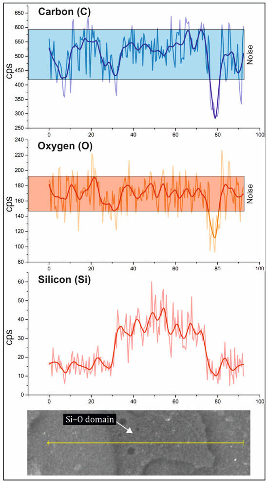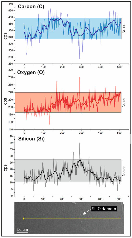 The surface of the PLA/PCL/SiO2 100/0/1 sample was initially without pronounced textures or protrusions. Short-term (minutes) exposure to the electron beam etched the surface, revealing thin Si- and O-rich linear structures that protruded from the surface of the sample, giving the sample a distinct topographical dimension. Moreover, in the sample PLA/PCL/SiO2 100/0/1, a linear elemental analysis (SEM-EDS) was performed. The analysis site was selected to cross both the matrix and the silica-rich linear domain, as shown in Figure 6. In the profile, the light-colored graph represents the raw signal intensity line, whereas the dark-colored graph denotes the averaged intensity line, providing a clearer interpretation of elemental distribution. The elemental distribution along the line-scan profile reveals a notable increase in the concentrations of Si and O at the locations of the protruding lines. At the same time, a decrease in the concentration of C is observed, indicating the presence of a Si–O phase.