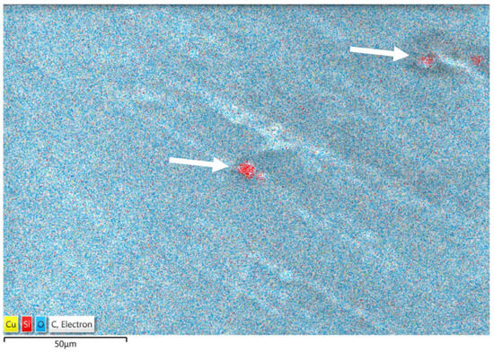 The EDS element distribution map of sample PLA/PCL/SiO2 100/0/3 with the Si-rich particles (arrows indicate Si-rich densifications).