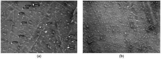 Surface morphology of the sample PLA/PCL 70/30 with added (a) 1% SiO2 and (b) 3% SiO2. The points on the images indicate areas analyzed by the SEM-EDS.