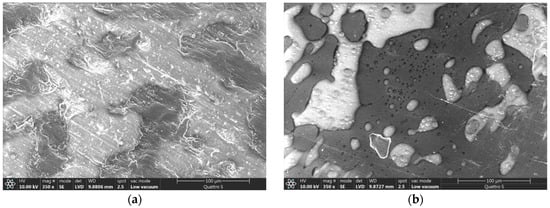 In our previous research [33], we found that PLA/PCL samples without nanoparticles have two distinct phases in the surface fracture, with spherical domains of dispersed PCL in PLA. In Figure 1a, SEM images show the PLA matrix and the dispersed PCL domains, taken at 3000× magnification. The spherical PCL domains are marked with black arrows and correspond to the typical morphology of sea-island morphology [30]. The sample with the same amount of components, the PLA/PCL 50/50 sample, shows visible cracks and slight delamination of the materials (marked with white arrows), indicating that PLA and PCL are incompatible and immiscible polymers.