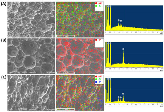 SEM micrographs, elemental mapping and the corresponding EDS spectrum of PUF/20HNT (A), PUF/20TPP (B), and PUF/20TPP/20HNT (C).