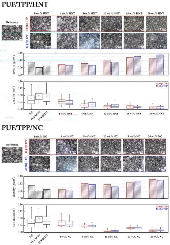 The photos of the cross sections, apparent densities, and box-plots of the cell area of PUF/TPP/HNT and PUF/TPP/NC.