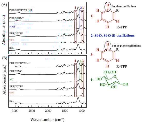 (A) FTIR spectra of individual HNT, TPP, reference PUF, PUF/20TPP, PUF/20HNT, and PUF/20TPP/20HNT; (B) FTIR spectra of individual NC, TPP, reference PUF, PUF/20TPP, PUF/20NC, and PUF/20TPP/20NC. The red, blue, and green dashed zones indicate the presence of TPP, HNT, and NC bands in the FTIR spectra of the final nanocomposite PUF samples, respectively.