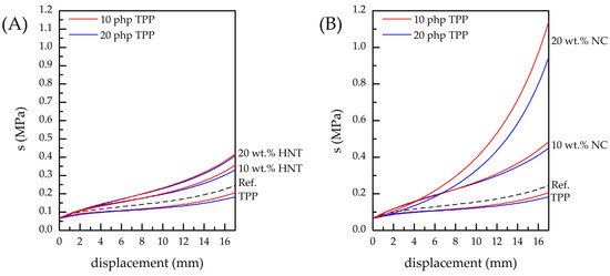 Results of compression force deflection measurements for the reference PUF, PUF modified with 10 php and 20 php of TPP and nanocomposite PUF: (A) PUF/10TPP/HNT and PUF/20TPP/HNT, (B) PUF/10TPP/NC and PUF/20TPP/NC.