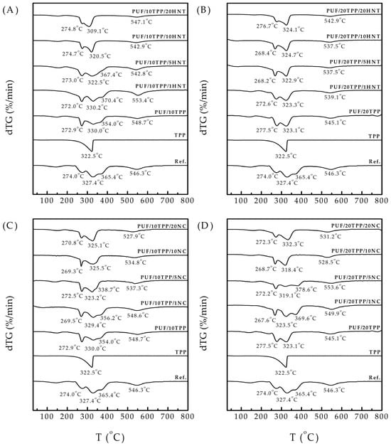 dTG curves of reference PUF, single TPP, PUF modified with 10 php and 20 php of TPP, and nanocomposite PUF: (A) PUF/TPP10/HNT, (B) PUF/TPP20/HNT, (C) PUF/TPP10/NC, and (D) PUF/TPP20/NC.