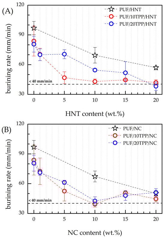 Burning rates of PUF/TPP/HNT (A) and PUF/TPP/NC (B) in comparison with reference PUF, foams modified with 10 and 20 php of TPP and 10 and 20 wt.% of HNT and NC. The horizontal dashed line represents burning rate of 40 mm/min, which corresponds to HB class.