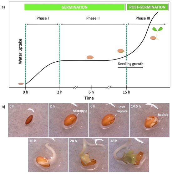 Before performing germination tests, the kinetics of the early stages of the germination of Lepidium sativum L. seeds was studied to ascertain whether further endpoints could be identified. Seed germination is a complex process which involves several biochemical, physiological, and morphological transformations within the seed [48]. It starts with the absorption of water through the micropyles, small pores present on the testa tegument, by the dormant dry seeds and is completed when the radicle protrudes from the covering structures by 2 mm. The progress of seed germination is strictly related to its water uptake rate and can be subdivided into three phases (Figure 2) [49]. During phase I (the early germination phase or imbibition), seeds are rapidly imbibed by water, causing the seed coat to expand and soften until it reaches the early plateau of water uptake. Moisture triggers an increase in cellular respiration and activates hormone activity (Figure 2a).