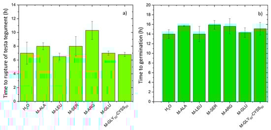 The early phases of the germination of Lepidium sativum L. seeds in water and in PAA water solutions were monitored by an optical microscopic analysis (Figure 2b) to highlight the possible effects of the interference of PAAs on the biochemical processes that take place during embryo (seed) maturation. The times for complete imbibition, the rupture of the testa tegument (preliminary to radicle protrusion), and germination, corresponding to 2 mm radicle emergence, were detected. The maximum tested concentration of the PAA solutions was 2.5 mg mL−1 in the seed germination tests (Section 3.3). The time for complete imbibition was, in both water and PAA solutions, approximately 2 h. Interestingly, in all experiments, the germination time did not significantly differ from that detected in water (Figure 3b). However, the time to rupture of the testa tegument significantly differed from that detected in water in the experiment carried out with M-ARG (Figure 3a), the only predominantly cationic PAA. This result suggests the interference of M-ARG in the biochemical processes that occur during embryo maturation; indeed, this PAA proved to be the most phytotoxic of all, as will be shown in the following sections. It may therefore be preliminarily concluded that the analysis of the initial stages of germination could be a useful bioindicator and, additionally, that the early phases of the germination process of Lepidium sativum L. seeds proceed smoothly in PAA solutions in the selected conditions.