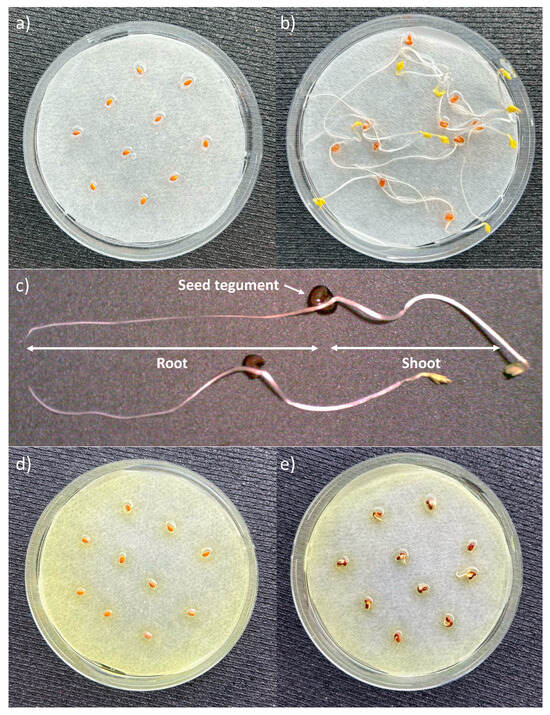 Lepidium sativum L. seedling growth after seed exposure to deionized water at 0 (a) and 120 h (b). Optical microscope image of seedlings grown in deionized water (c). Effect of seed exposure to the positive control (0.1% K2Cr2O7) at 0 h (d) and 120 h (e).