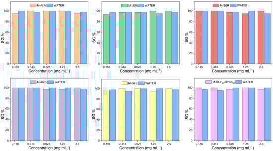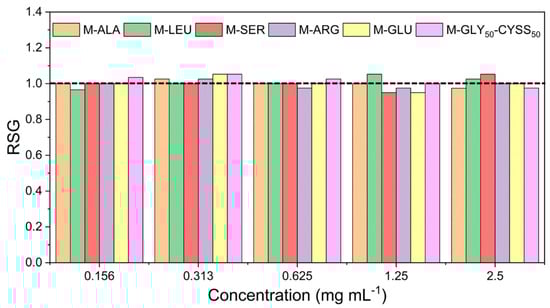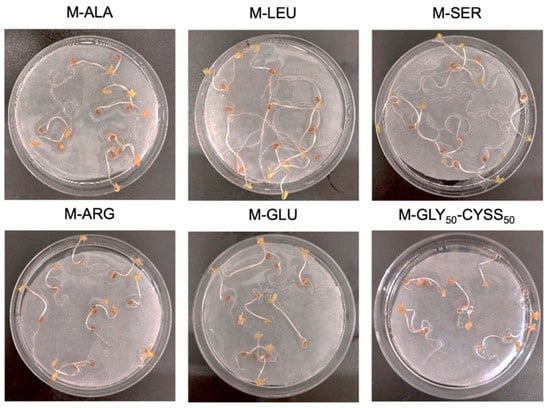 To better analyze the effect of PAAs on the radicle growth of Lepidium sativum L., the Relative Root Growth (RRG) was calculated as the ratio of the length of roots grown in PAA solutions to that of roots grown in water (Equation (4), Section 2.3). A chemical compound is normally classified as a plant fertilizer when its RRG ≥ 1, while it is classified as an inhibitor when its RRG < 1. Figure 10 and Table S3 show the RRG values after 120 h of seed exposure to PAA water solutions at different concentrations. Notably, all PAAs had an inhibiting effect at 2.5 mg mL−1, but the RRG was above 0.9 in the case of M-SER and M-GLU. M-SER’s stimulating effect was observed in the concentration range 0.156–1.25 mg mL−1 and M-GLY50-CYSS50 and M-ALA’s at 0.156 mg mL−1. A regular increase in the inhibitory effect with the concentration of M-ALA, M-LEU, M-ARG, and M-GLY50-CYSS50 was observed. Not unexpectedly, M-ARG showed an inhibitory effect at all tested concentrations, consistent with the results of the root length measurements.