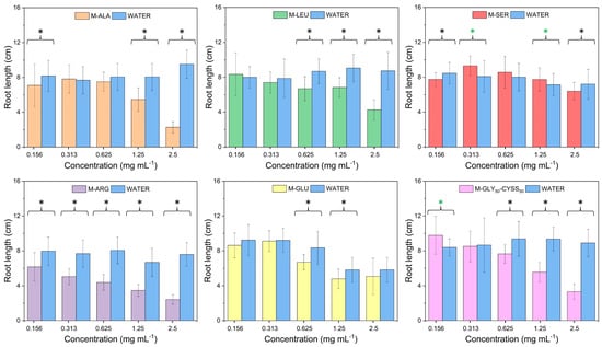 Concentration dependence of the length of Lepidium sativum L. roots after seed incubation in PAA aqueous solutions for 120 h (colored bars). For each PAA concentration, tests were conducted in quadruplicate in parallel to tests performed on an equal number of seeds incubated in water, which were taken as the negative control (blue bars). The results are reported as the mean ± confidence. Asterisks indicate significant differences (p-value < 0.05) compared to the control: the black asterisks indicate a greater length in water, the green asterisks a greater length in the PAA solution.