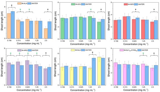 Concentration dependence of the length of Lepidium sativum L. shoots after seed incubation in PAA aqueous solutions for 120 h (colored bars). For each PAA concentration, tests were conducted in quadruplicate in parallel to tests performed on an equal number of seeds incubated in water, which were taken as the negative control (blue bars). The results are reported as the mean ± confidence. Asterisks indicate significant differences (p-value < 0.05) compared to the control: black asterisks indicate a greater length in water, and green asterisks a greater length in the PAA solution.