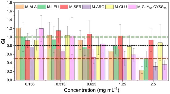 The concentration dependence of the GI after seed incubation in PAA solutions for 120 h is shown in Figure 11 and Table S4. The collected results indicate that most PAAs are phytotoxic at the highest tested concentration, 2.5 mg mL−1, except M-SER and M-GLU, which show only a modest inhibitory effect. In line with the RRG data, M-SER exhibited a clear stimulating effect from 0.313 to 1.25 mg mL−1. The GI values confirmed that the most toxic PAA of all is M-ARG, the prevailingly cationic one, which features a GI < 0.8 across the whole concentration range tested and a GI equal or less than 0.5 above 0.625 mg mL−1. M-GLU, the most anionic of all PAAs, is non phytotoxic at all concentrations and slightly stimulating at 0.313 mg mL−1. M-LEU has borderline behavior at 0.625 and 1.25 mg mL−1, while M-ALA and M-GLY50-CYSS50, featuring a medium–high positive/negative charge value per repeat unit (0.66 and 0.72, respectively), are both phytotoxic at concentrations above 1.25 mg mL−1 and show similar general behavior across the whole concentration rage.