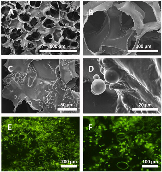 SEM and fluorescence microscope images of the combined structure. SEM was used to study the structure of the HA scaffold with the gelatin microparticles crosslinked with genipin (images (A–D)) at 5×, 30×, 600×, and 2000×, respectively. Images (E,F) show the distribution of gelatin microparticles crosslinked with genipin and loaded with BSA-FITC in the HA scaffold once vacuum-injected at 10× and 20×, respectively.