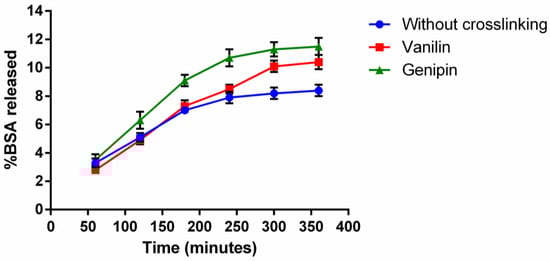 The effects of the crosslinkers on the BSA release pattern were examined. For the non-crosslinked microparticles, a linear release was observed during the first 4 h, reaching a value of 8% of BSA released, a value for which it stabilized during the next 2 h. For the microparticles crosslinked with vanillin, the percentage of BSA released was very similar to that of the non-crosslinked microparticles during the first 4 h, although the saturation value was obtained for 10% of BSA released after 5 h. In the case of the microparticles crosslinked with genipin, a greater release of BSA was observed for all times, also following a linear trend during the first 4 h and saturating at about 12% of BSA released after 5 h. The linear trend of the release of BSA during the first 4–5 h could relate to the amount of BSA deposited close to the surface of the microparticles due to the weak interactions between BSA and gelatin [65]. This response was expected since no enzyme was used for the degradation of the microparticles. The similar release profiles suggest an inhomogeneous crosslinking with vanilin and genipin that could result from the high molecular weight of the crosslinkers used during the water-in-oil emulsion [66]. Once the BSA close to the surface is released, the release rate slows down, so that the rest of the BSA contained in the microparticles (92%, 90%, and 88% for microparticles without crosslinking, crosslinked with vanillin, and crosslinking with genipin, respectively) are released following the degradation rate of the microparticles. As can be observed in Figure 4D, the crosslinking agents stabilized the microparticle matrix, slowing down the degradation, providing better protection for the encapsulated BSA protein, and helping to achieve a more sustained and controlled release profile.