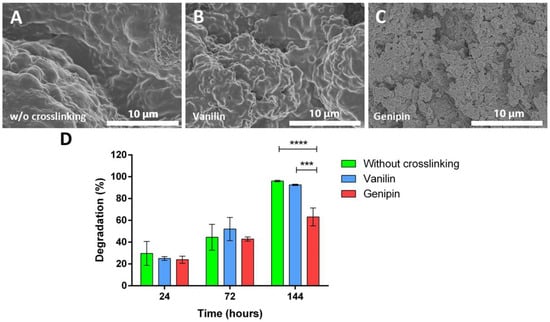Degradation study of microparticles. SEM pictures of the microparticle morphologies without crosslinking (A), crosslinked with vanilin (B), and crosslinked with genipin (C), showing less degradation on the genipin-crosslinked microparticles. Degradation of microparticles after 24, 72, and 144 h (D), confirming the lesser degradation of the genipin-crosslinked microparticles. Statistically significant differences are indicated by *** and ****, indicating p-values below 0.001 and 0.0001, respectively.