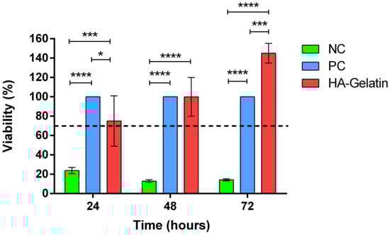 Cell viabilities via MTT assay after 24 h, 48 h, and 72 h. Cytotoxicity by indirect contact (extracts) of the negative control (NC), positive control (PC), and genipin-crosslinked gelatin microspheres on HA scaffold (HA–gelatin) using mouse fibroblast cells (L929). If the cell viability of the sample is >70%, the material shall be considered non-cytotoxic (dotted line). Statistically significant differences are indicated by *, *** and ****, indicating p-values below 0.05, 0.001 and 0.0001, respectively.