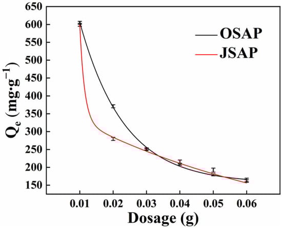 The SAPs with different dosages were used to adsorb Cd(II) to determine the optimal dosage of OSAP and JSAP. As shown in Figure 2, when the dosage of OSAP/JSAP was in the range of 0.01–0.03 g, the amount of Cd(II) adsorbed initially decreased rapidly, followed by a slower decline. The inflection point occurred at 0.03 g. The inflection points for OSAP and JSAP occurred at 0.03 g and 0.02 g, respectively. We chose the dosage of one unit to the right of the inflection point as the best dosage of the SAP. is the adsorption capacity of Cd(II). The calculation method of is detailed in Text S1.