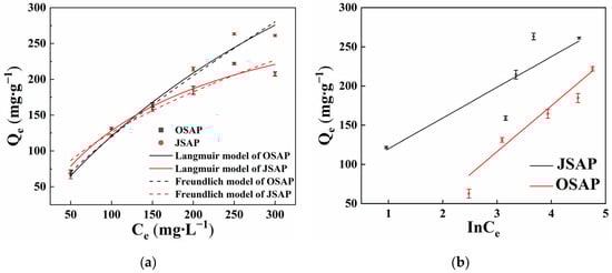The Langmuir and Freundlich adsorption models were used to fit the adsorption process of Cd(II) by OSAP/JSAP []. As shown in Figure 3a, the amount of adsorbed Cd(II) increases with increasing solution concentration. Figure 3b illustrates the fitting of the adsorption process with the Temkin model. Ce is the residual concentration of Cd(II) in the solution. InCe means “taking the logarithm of Ce”.