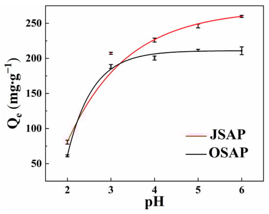 The pH value significantly affects the adsorption capacity of trace metals. It is an important parameter in adsorption research as it reflects the surface charge of the adsorbent [,]. Cd(II) in the solution begins to precipitate and convert into Cd(OH)2 when the pH value exceeds 7. Therefore, experiments on the adsorption capacity for Cd(II) are not conducted when the pH value exceeds 7. Figure 4 shows the Cd(II) adsorption capacity by OSAP/JSAP at different pH levels. Cd(II) adsorption capacity increases significantly within the initial pH range of 2.0–3.0. The adsorption capacity for Cd(II) is low at lower pH values. The reason for this is that the increased concentration of H+ in the solution leads to competition between cations. Cd(II) does not bind with surface functional groups, leading to lower adsorption capacity of OSAP/JSAP for Cd(II) at low pH values. A series of acidic functional groups undergo dissociation when the pH value rises. The electrostatic interaction between negatively charged functional groups and Cd(II) enhances the adsorption capacity [].