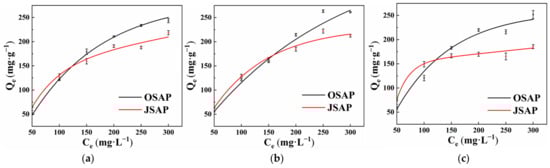 A total of 30 mg of OSAP and 40 mg of JSAP were separately mixed with 50 mL Cd(II) solutions at different concentrations (50, 100, 150, 200, 250, and 300 mg∙L−1) in centrifuge tubes. The pH was adjusted to 5.0 using 0.1 mol∙L−1 HNO3 or NaOH. The centrifuge tubes were placed on an oscillator and shaken for 24 h at 25 °C at 200 rpm. The method for filtering the solution and measuring the concentration was the same as the method described above.