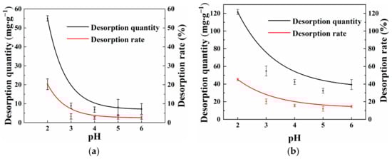 Studying the desorption characteristics of Cd(II) on OSAP/JSAP is crucial for determining adsorption stability. Figure 6a,b shows the effect of OSAP and JSAP on Cd(II) desorption at different pH levels. The results illustrate that the desorption amounts of OSAP/JSAP decrease sharply in the initial pH range of 2.0–3.0, and the desorption amounts slowly balance with the increase in pH from 3.0 to 6.0. The desorption rates of Cd(II) by OSAP and JSAP at a pH of 3 were of 3.28% and 20.37%, respectively. OSAP has lower desorption quantity, demonstrating greater stability compared to JSAP under different pH conditions.