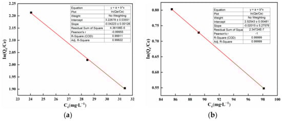 As shown in Figure 7a,b, the horizontal axis is the residual Cd(II) concentration in solution, while the vertical axis is . The slope is the equilibrium constant . Both the slope and intercept are used for obtaining ΔG0. Subsequently, ΔG0 is used to calculate ΔH0 and ΔS0. R2 (R-squared), also known as the coefficient of determination, is an important concept in statistics used to measure the goodness of fit of a statistical model.