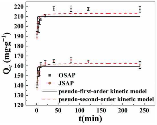 A total of 30 mg of OSAP and 40 mg of JSAP were separately mixed with 500 mL Cd(II) solutions at 200 mg∙L−1 concentration in beaker. The pH was adjusted to 5.0 using 0.1 mol∙L−1 HNO3 or NaOH. Then, 5 mL samples were extracted from the solution using a syringe at reaction times of 5, 10, 20, 40, 80, 120, and 240 min. The method for filtering the samples and measuring the concentration was the same as the method described above.