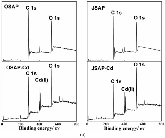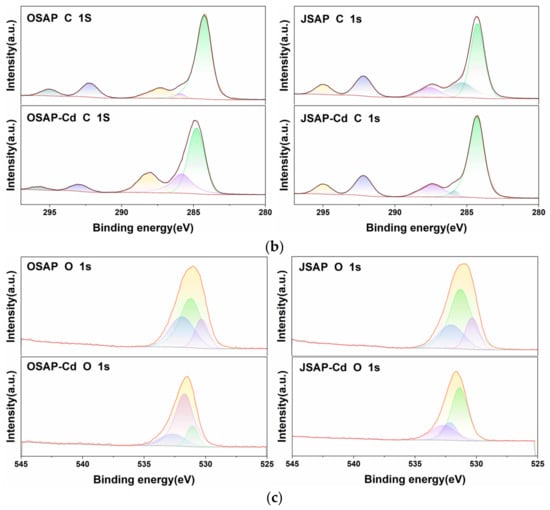 Figure 9 shows the XPS spectra of OSAP/JSAP before and after Cd(II) adsorption. One color represents one functional group, highlighting changes in functional groups before and after the reaction. As shown in Figure 9a, the appearance of a Cd(II) peak after the adsorption of Cd(II) indicates that OSAP/JSAP successfully adsorbed Cd(II). The C 1s and O 1s peaks were detected at 299.35 and 546.35 eV, respectively. Using the area simulation curve, the element O values of OSAP/JSAP surfaces were computed to be 9.82% and 11.68%, respectively. These values indicate that the surface of organic JSAP has a high oxygen content. The main elements in the O 1s spectrum are -OH (531.8 eV) and C-O (533.72 eV). The peak areas of JSAP/OSAP increased by 0.03% and 12.58%, respectively, after adsorbing Cd(II). The peak area of C-O decreased by 1.12% in JSAP and increased by 0.04% in OSAP. The oxygen-containing groups have a noticeable significant increasing tendency. The abundant oxygen-containing functional groups in OSAP-Cd and JSAP-Cd may be attributed to the loading of C-O and -OH on the material surface. Chen [] investigated the use of synthetic mineral adsorbents to remove Cd(II) and Pb(II) ions from aqueous solutions. They discovered that the adsorption of Cd(II) by adsorbents caused an increase in the concentration of oxygen functional groups; Huang [] contrasted the XPS spectra of the materials before and after Cd(II) adsorption. They discovered that the quantity of functional groups increased when the O 1s peak intensified after adsorption. This is consistent with the results of this research. This phenomenon could be attributed to the utilization of pure water containing -OH as the background solution in the adsorption experiment. The -OH is adsorbed onto the material’s surface, leading to an augmentation of the oxygen-containing functional groups on OSAP-Cd and JSAP-Cd. According to related research, samples containing more oxygen functional groups exhibit stronger electronegativity and complexation [].