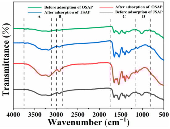 Figure 11 shows the FTIR spectra before and after the adsorption of Cd(II) by OSAP/JSAP. It shows that the spectra of OSAP/JSAP have been roughly categorized into four regions(A, B, C, D) based on the location of the adsorption peak: The primary part of Region A, which spans 3100–3750 cm−1, is hydroxyl vibrations (-OH) [,]; Region B, 2800–3000 cm−1, is the vibration region of aliphatic C-H []. The Region C, 1200–1750 cm−1, is oxygen-containing functional groups, mainly including hydroxyl, carbonyl, and carboxyl groups, as well as the stretching vibration of C=O and aromatic C=C bond structures, and the bending vibration of -CH2 and -CH3 []. Region D, 700–1200 cm−1, is unsaturated hydrocarbon C-H in-plane stretching vibration and out-of-plane deformation vibration, as well as inorganic mineral vibration. The hydroxyl adsorption peak is higher than the hydrocarbon adsorption peak and occurs at a frequency greater than 3000 cm−1. This phenomenon provides confirmation that -OH exists. The free -OH adsorption peak appears in the range of 3600–3700 cm−1, and the intramolecular association -OH adsorption peak appears in the range of 3000–3500 cm−1 []. Alcohols and phenolic hydroxyl groups appear in the range of 3000–3500 cm−1 wider peaks and 3600 cm−1 sharper peaks [].