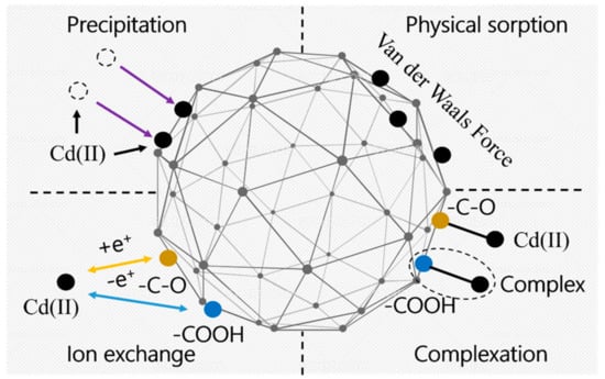 The primary factor in determining physical adsorption is the specific surface area of the material, which is positively correlated with van der Waals forces. An increase in the specific surface area of the material leads to enhanced van der Waals forces, resulting in an improvement in the adsorption capacity of the adsorbent []. Kinetic experiments indicate that the adsorption of Cd(II) by materials follows chemical adsorption and is characterized by quasi-second-order kinetic models []; Materials with greater specific surface areas, such as zeolite [] and biochar [], have a greater specific surface area than the material in question.