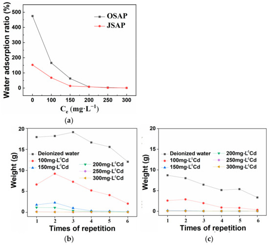 As shown in Figure 14a, the water adsorption ratios of OSAP and JSAP are 474.8 and 152.6 in pure water, respectively. This provides the reference values for the adsorption capacities of SAP without Cd(II) interference. When the concentration of Cd(II) solution increases, there is a noticeable decrease in the adsorption of water by OSAP and JSAP. This indicates that Cd(II) has a negative impact on the water adsorption capacity of SAP. The water adsorption rates of OSAP and JSAP exceed 10% of that in pure water, when the concentrations of Cd(II) solution are of 150 mg·L−1 and 100 mg·L−1, respectively. This implies that, although Cd(II) has a negative impact on the water adsorption capacity of SAP, SAP can still maintain good water adsorption capacity within a certain concentration range. See Text S6 for detailed calculations.