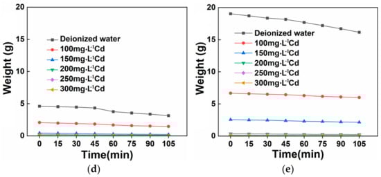 A total of 30 mg of OSAP and 40 mg of JSAP were separately mixed with pure water and Cd(II) solutions at different concentrations (100, 150, 200, 250, and 300 mg∙L−1) in beakers. The pH was adjusted to 5.0 using 0.1 mol∙L−1 HNO3 or NaOH. The beakers were placed on an oscillator and shaken for 24 h at 25 °C at 200 rpm. Then, they were removed from the water and weighed to calculate the water adsorption ratio. Finally, they were left to air for natural dehydration, and weighed at 0, 15, 30, 45, 60, 75, 90, and 105 min to measure their water-retaining property. The operation above was repeated six times to measure the repeated water adsorption property.