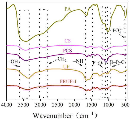 FTIR spectra of PA, CS, PCS, UF, and FRUF-1.