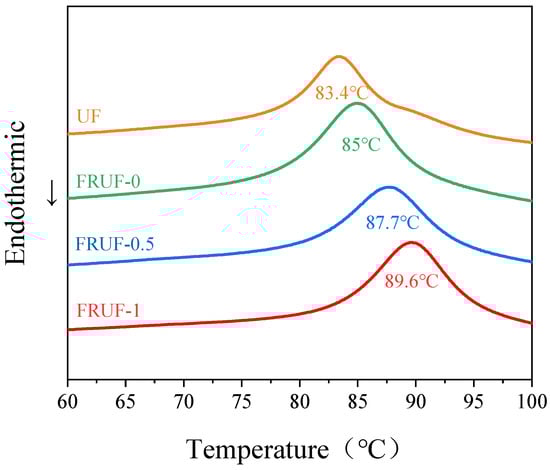 As shown in Figure 2, the overall trend of the DSC exothermic peaks for different resins was the same, with a clear exothermic peak appearing, indicating that the optimization of the structure, addition of composite curing agents, and addition of PCS did not change the overall curing behavior of the resin. Compared with that of UF, the peak temperature of the exothermic peak of FRUF-0 only increased by 1.6 °C. Compared with that of FRUF-0, the peak temperature of FRUF-0.5 increased by 2.7 °C, whereas that of FRUF-1 increased by 4.6 °C, indicating that the addition of PCS increases the temperature for resin curing. This is because PCS, as a large molecule, hinders the movement of the resin macromolecular chains, leading to a decrease in reactivity.