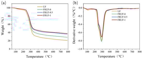 The TG results for the different resins are presented in Figure 3 and Table 2. As shown, the structure optimization, use of a composite curing agent, and addition of PCS did not change the thermal decomposition process of the UF resin. Further, after structure optimization and curing with the composite curing agent, the temperature of the resin at a decomposition mass of 5% increased significantly from 197.3 to 237.6 °C, mainly because of the high decomposition temperature of ammonium polyphosphate contained in the composite curing agent. However, after the addition of PCS, the decomposition temperature of the resin decreased slightly, but with the further increase in PCS content, the decomposition temperature began to increase. Overall, the optimized structure and composite curing agent had little effect on the temperature at which the resin reached its maximum decomposition rate, whereas the addition of PCS resulted in an increase in the temperature at which the resin reached its maximum decomposition rate. Notably, structure optimization and the addition of composite curing agents and PCS significantly improved the thermal stability of the resin. In addition, the residual carbon content of FRUF-0 increased by 7.8 wt.% compared to that of UF at 800 °C, and the carbon residue of FRUF-1 with 1 wt.% PCS was as high as 37.8%, almost twice that of UF. The increase in the residual carbon content is attributed to the composite curing agent and the phosphate groups in the PCS, which promote matrix dehydration into carbon during the decomposition process, thereby protecting the matrix.