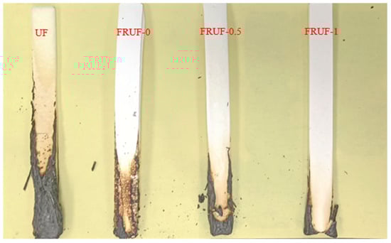 To demonstrate the flame-retardant performance of the material, UL-94 experiments and LOI tests were conducted. The UL-94 and LOI experimental results for the flame-retardant urea–formaldehyde resin are shown in Figure 4 and Table 3, respectively. The UF only reached the V-1 level in the UL-94 experiment with an LOI of 29.5%. FRUF-0 successfully passed the UL-94 V-0 grade test, and the LOI increased to 32.1%. After the addition of PCS, the ultimate oxygen index of the resin increased further, and the addition of 1 wt.% resulted in an ultimate oxygen index of 36%. With the optimization of the structure, use of composite curing agents, and an increase in the PCS content, the area of resin burning decreased. In the vertical combustion experiments, the UF burned to the middle and collapsed slightly in the lower half, whereas FRUF-1 burned only slightly at the bottom, as shown in Figure 4.