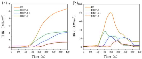To simulate the combustion of the samples, cone calorimetry tests were conducted. The results and parameters are shown in Figure 5 and Table 4, respectively. Although the time to ignition (TTI) only increased by 1 s, the total heat release (THR) of FRUF-0 decreased by 58.76% compared with that of UF, and the peak heat release rate (PHRR) also decreased by 54.19%. This indicates that the optimization of the UF resin structure and the use of composite curing agents improved the flame-retardant performance of the UR resin. After adding PCS, the TTI of the FRUF resin was significantly increased, whereas the THR and PHRR decreased. On increasing the amounts of PCS from 0 to 0.5 wt.%, the TTI increased from 135 to 167 s. At 1 wt.% PCS, the TTI of FRUF-1 was 220 s, but the THR and PHRR decreased relative to UF by 86.44% and 81.13%, respectively. These results indicate that PCS not only reduces the heat released by the UF resin during combustion but also significantly prolongs the time required for its ignition. The fire growth index (FGI) reflects the fire hazard level of materials, and a lower FGI indicates a lower fire hazard level []. Compared with UF, the FGI of FRUF-1 decreased by 85.37%, indicating that the fire hazard of the FRUF resin was significantly lower than that of unmodified UF.