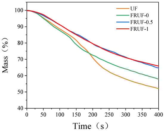 The mass losses during cone calorimetry tests are shown in Figure 6. As shown, the FRUF samples have increased residues compared to UF. That is, adding PCS increased the post-combustion residue. The results are consistent with TG testing.