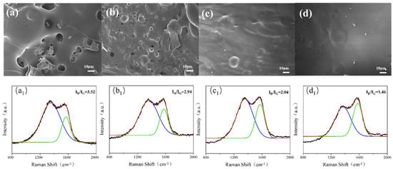 Next, SEM and Raman tests were performed on the carbonaceous residue after the complete combustion of the UF resin. Figure 7a reveals the presence of numerous large pores within the carbon residue, attributable to gaseous emissions during combustion, as well as many large fissures. Subsequent structural optimization and incorporation of the composite curing agent resulted in a more compact carbon residue from FRUF-0, which showed a reduced pore size, probably as a result of the phosphate moiety of ammonium polyphosphate (Figure 7b). The addition of PCS resulted in an absence of pores in the carbon residue of FRUF-0.5, although some surface wrinkling persisted (Figure 7c). Increasing the PCS content to 1 wt.% yielded a smoother carbon residue in FRUF-1 (Figure 7d). These observations indicate the formation of a dense carbon layer on the condensed phase of the FRUF resin throughout combustion, effectively insulating against oxygen and heat, thereby enhancing flame retardancy [].