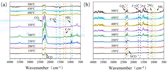 The thermal decomposition products of flame-retardant resins can be analyzed using TG-IR. Figure 8a indicates that the primary gaseous products include CO2 (2360 cm−1), NCO (2265 cm−1) [], carbonyl compounds (1627 cm−1), and NH3 (964 cm−1). Figure 8b shows that, in addition to the pyrolysis products of UF, those of FRUF-1, as revealed by new spectral peaks, were phosphorus-based substances, such as P-C (1265 cm−1) and PO2− (1140 cm−1). A comparative analysis of the spectral peaks of UF and FRUF-1 revealed a marked reduction in the intensity of the CO2 and NH3 signals for FRUF-1 between 200 and 400 °C, suggesting reduced gaseous emissions during combustion. This may be due to the phosphate groups present in PCS and APP, which likely facilitated carbon layer formation during combustion, thereby protecting the underlying substrate and mitigating pyrolysis.