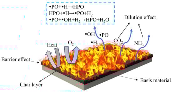 The aforementioned analyses suggest that the flame-retardant mechanism of the FRUF resin is as follows: a dense carbon layer forms on the condensed phase, isolating oxygen and combustion-generated heat. In the gas phase, non-combustible gases dilute oxygen, whereas phosphorus sequesters atmospheric free radicals, decelerating combustion chain reactions and reducing the extent of combustion []. This mechanism typifies an intumescent flame-retardant process, as depicted in Figure 9.