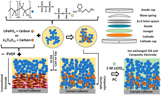 Depiction of ionogel synthesis and how the IG is used to fabricate different versions of anodes/cathodes. From bottom left to right, the depictions shows the conventional cast electrode with deposited IG separator and the composite electrodes with the IG separator layer with subsequent ion exchange. Pink coloring in conventional electrode represents imperfect penetration of IG SSE into electrode layer. Top right shows coin cell construction used to make full cell.